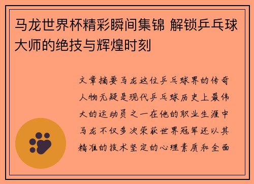 马龙的世界杯精彩瞬间,展现了他作为乒乓球大师的独特魅力。他不仅凭借精湛的技术战胜了世界顶级选手,更通过超凡的心理素质和精准的战术调整,打破了无数纪录,成为乒乓球界的传奇人物。每一场比赛,马龙都以不同的姿态诠释了什么是真正的乒乓球艺术。
